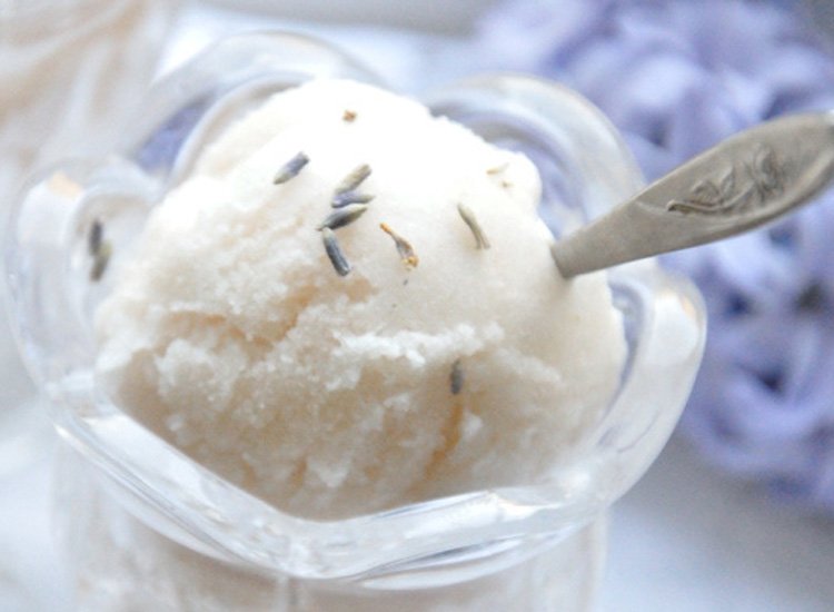 Wasser, Zucker und Honig vermischen und erwärmen, bis Zucker und Honig schmelzen. Vom Feuer nehmen, Lavendel hinzufügen, abdecken und eine halbe Stunde ruhen lassen. Gießen Sie es ein, fügen Sie Zitronensaft hinzu und befolgen Sie die Anweisungen Ihrer Eismaschine.