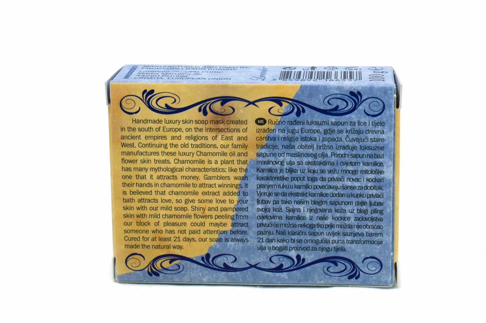 Handgefertigte Luxusseife für Gesicht und Körper, hergestellt im Süden Europas, wo sich die alten Reiche und Religionen des Ostens und des Westens kreuzen. Unter Wahrung alter Traditionen stellt unsere Familie sorgfältig luxuriöse Olivenölseifen her. Unsere klassische Seife reift immer mindestens 21 Tage, damit sich das Öl vollständig in ein reichhaltiges Körperpflegeprodukt verwandeln kann. Eine Volkslegende besagt, dass Kamille Geld anzieht und Spieler ihre Gewinnchancen erhöhen, indem sie ihre Hände in Kamille waschen. Dem Bad zugesetzter Kamillenextrakt soll die Liebe anziehen, also schenken Sie Ihrer Haut Liebe mit unserer milden Seife. Kamille wird vielleicht jemanden anlocken, der vorher vielleicht nicht darauf geachtet hat.