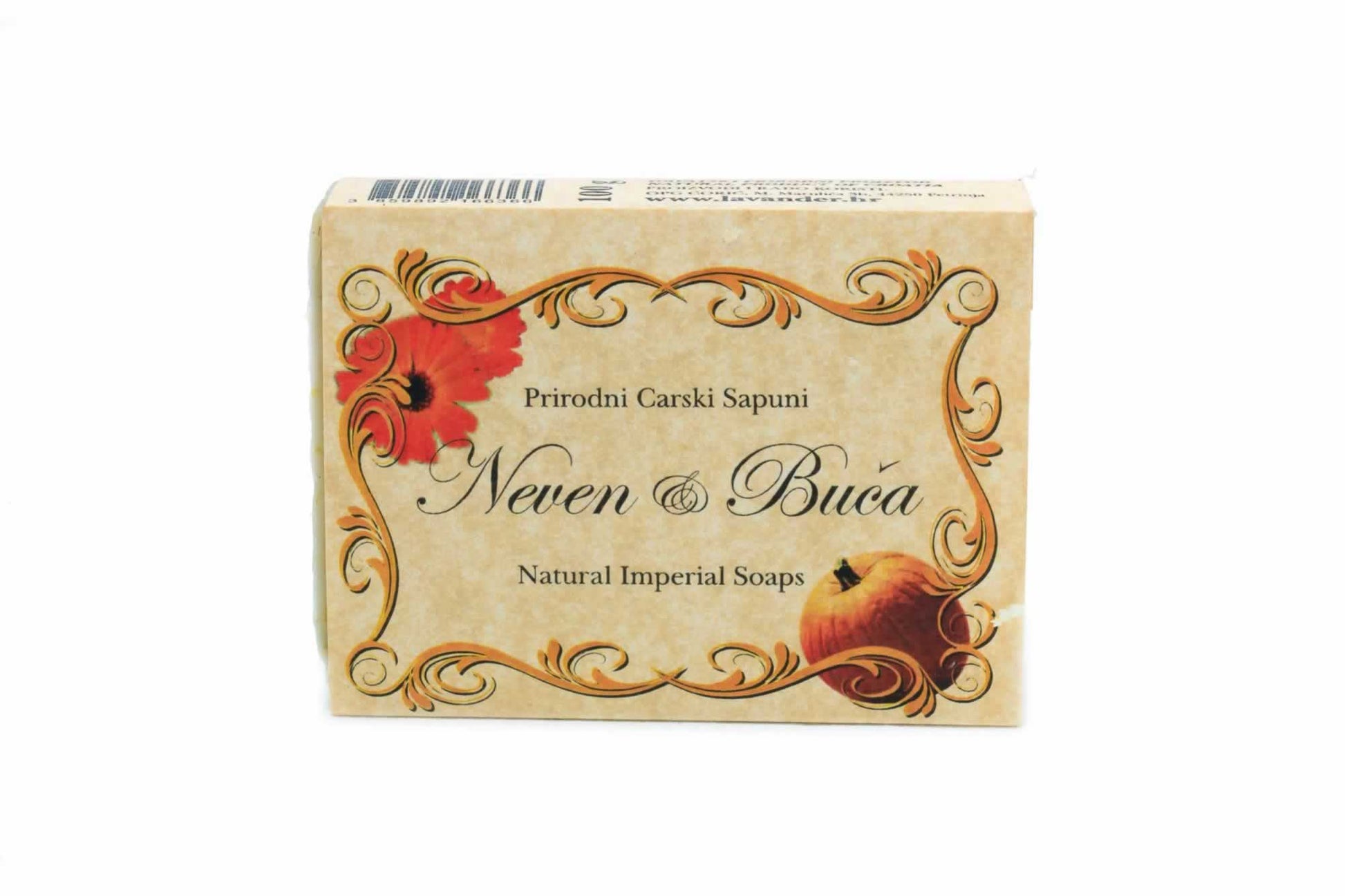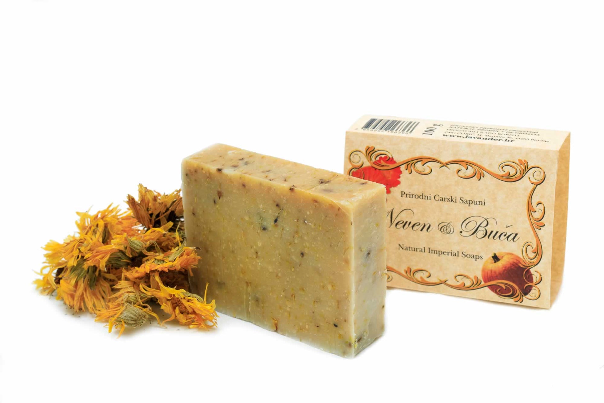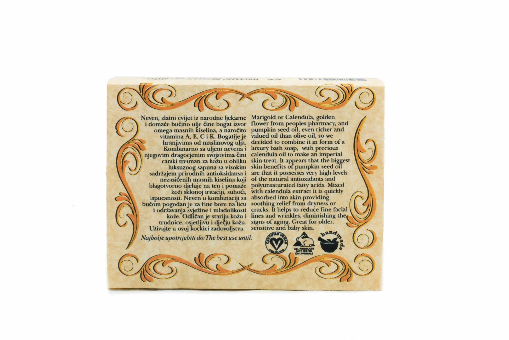Handgefertigte Luxusseife mit Ringelblume für Gesicht und Körper, hergestellt im Süden Europas, wo sich die alten Reiche und Religionen des Ostens und des Westens kreuzen. Unter Beibehaltung alter Traditionen stellt unsere Familie luxuriöse handgemachte Seife aus Olivenöl unter Zusatz von Öl, Ringelblumenblüten und aromatischem Kürbisöl her. Diese sanfte Seife hilft auch bei verschiedenen Hautproblemen wie Dermatitis, Ekzemen, Windeldermatitis und dergleichen. Wir empfehlen es für Gesicht und Körper, für alle Hauttypen und insbesondere für Haut, die zu Akne und Dermatitis neigt. Unsere klassische Kürbiskernöl- und Ringelblumenseife reift immer mindestens 21 Tage, damit sich die Öle vollständig in ein reichhaltiges Körperpflegeprodukt verwandeln können.
